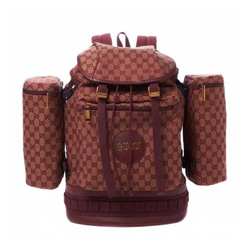 Link to: GUCCI GG Monogram Script Logo Large Double Pocket Backpack Sahara Rubino Bordeaux